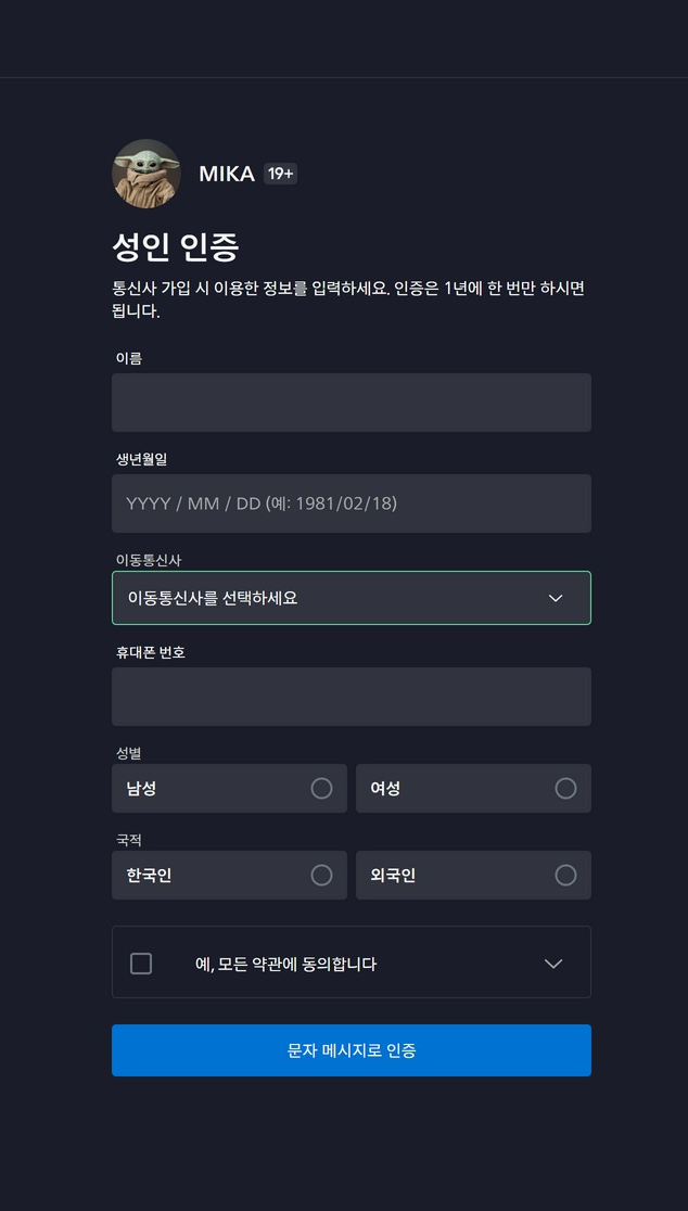 성인 인증 화면이 뜨면 지금 인증 버튼을 누르고 위 개인 정보들을 입력해 준 후,