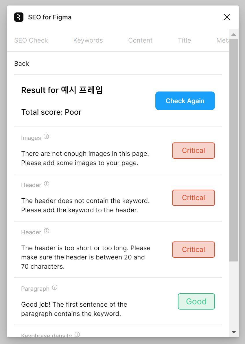 Check elements on SEO버튼을 누르면 아래와 같이 SEO결과를 보여준다