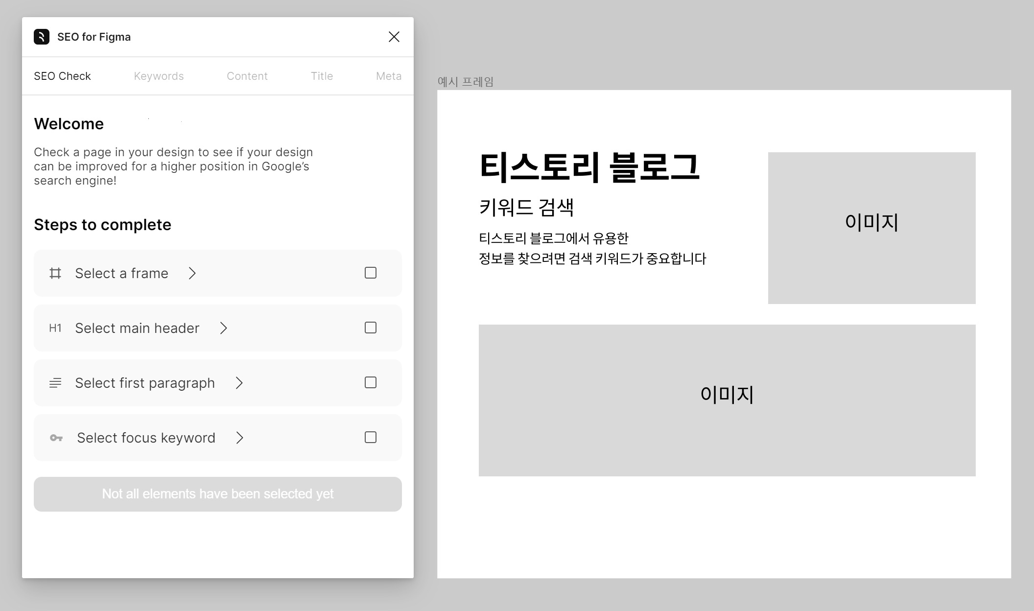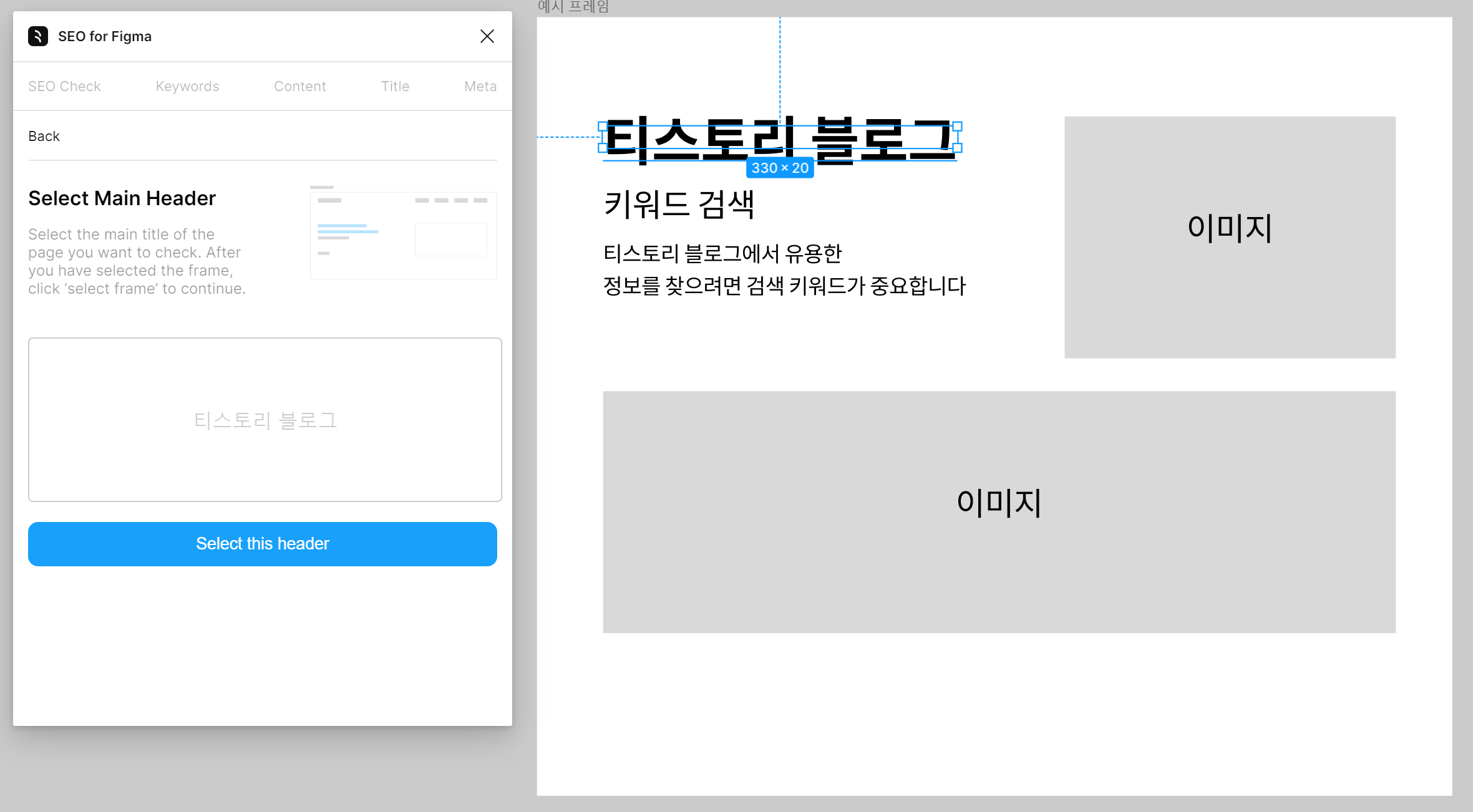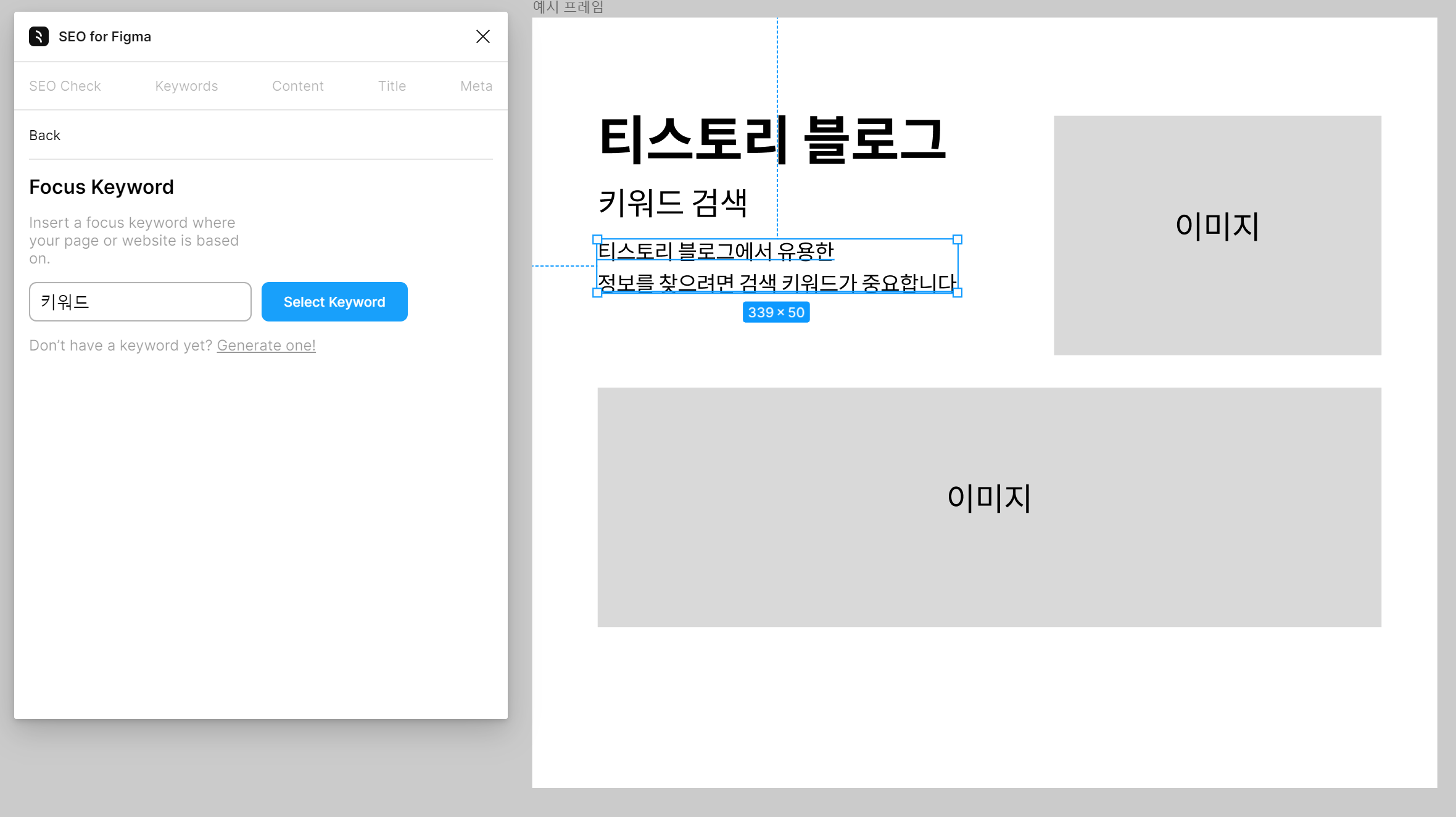 피그마에서 제작한 콘텐츠 프레임을 선택하고 SEO플러그인을 실행하면